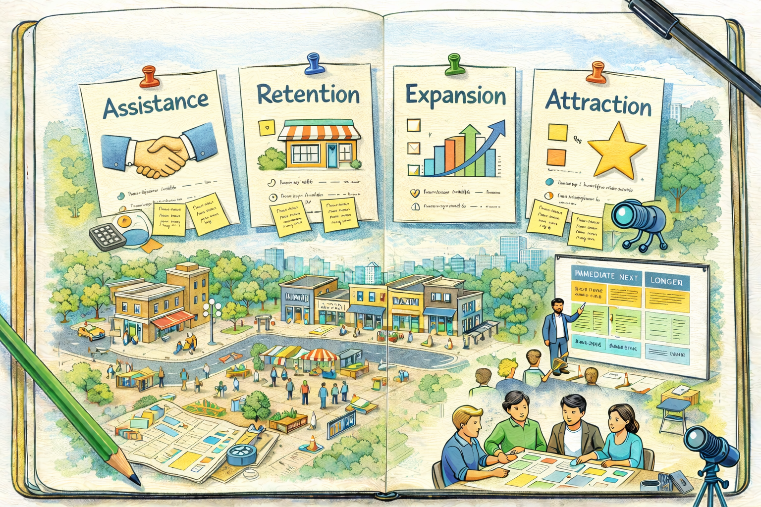 The Downtown AREA Blueprint is a comprehensive, three month engagement for communities that need a clear strategy and stronger alignment between partners. Built around the AREA framework—Assistance, Retention, Expansion, and Attraction—this service organizes downtown revitalization into manageable, actionable parts.